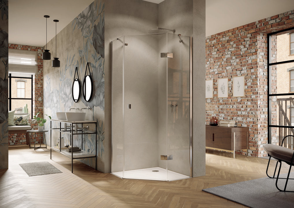 • Partially framed, pentagonal shower enclosure with one glass panel,