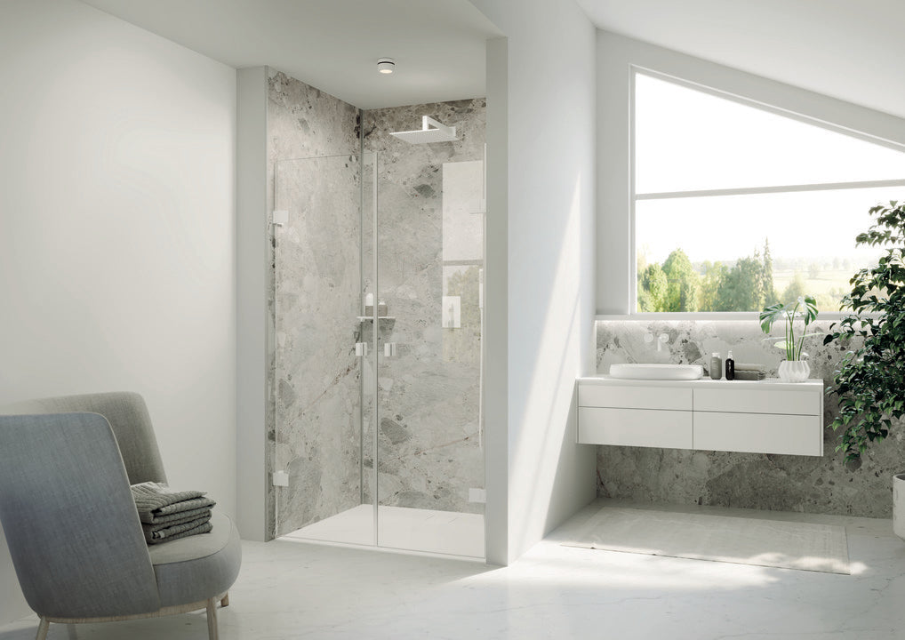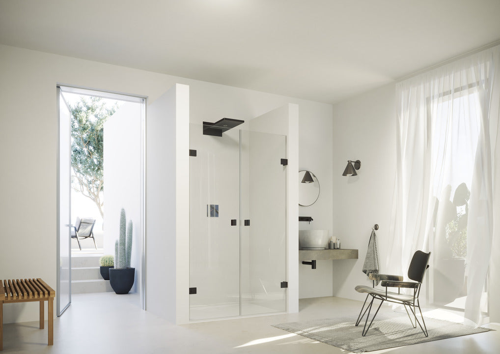 • Frameless door with two glass panels, opening inwards and outwards